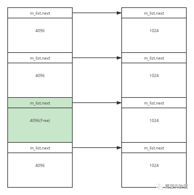 这样会有几率出现一种情况,有两个4096的struct msg_msg结构体指向同一个1024的struct msg_msg B,这个1024的struct msg_msg B地址最后几个字节为0.