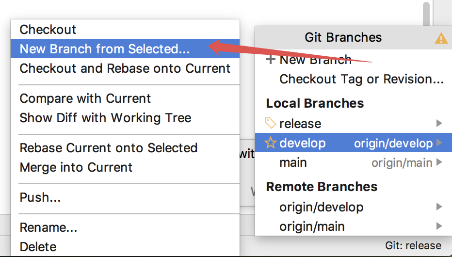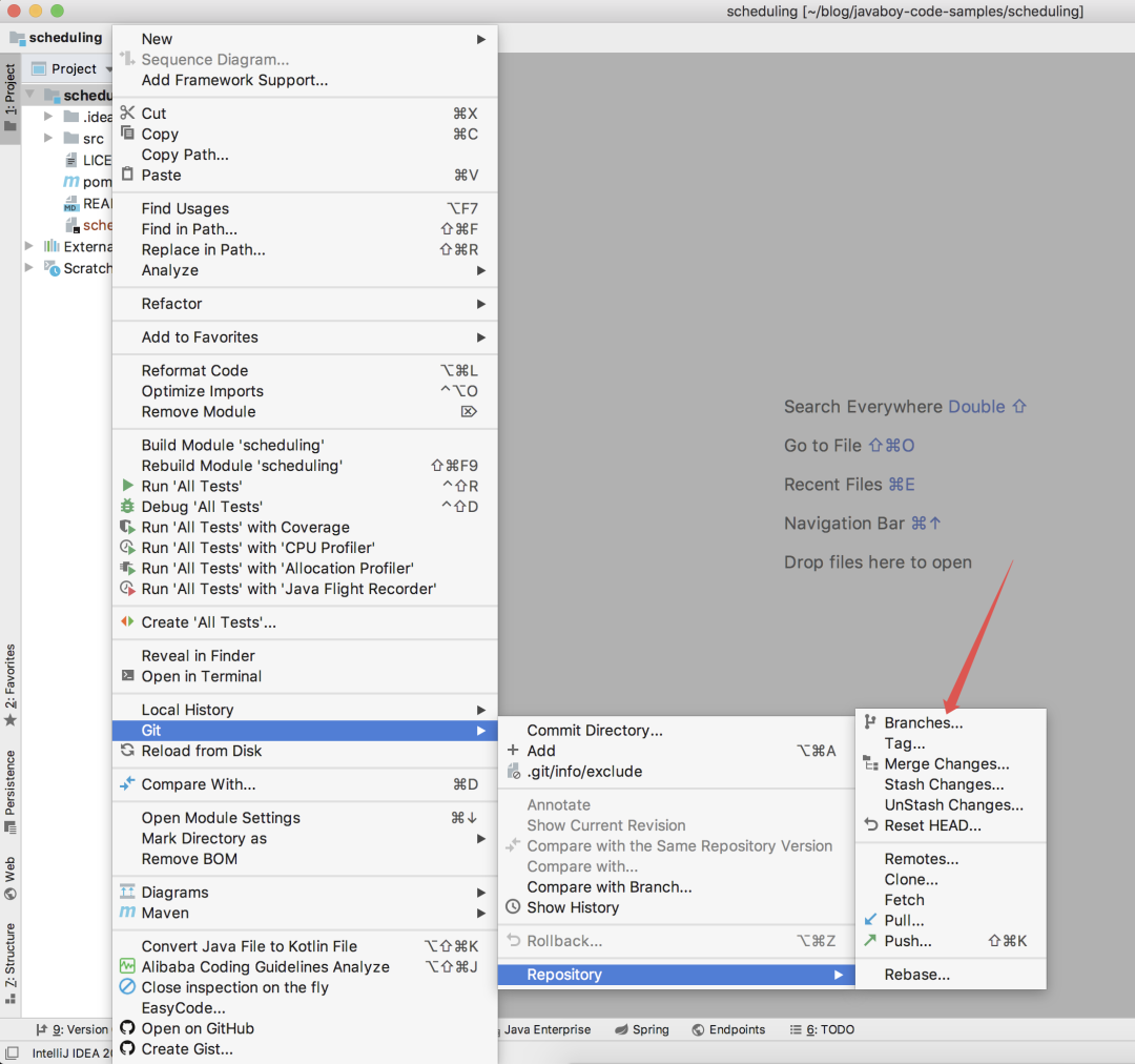 假设我们先创建 develop 和 release 分支,创建方式如下,选中当前工程,右键单击,然后依次选择 Git->Repository->Branches...: