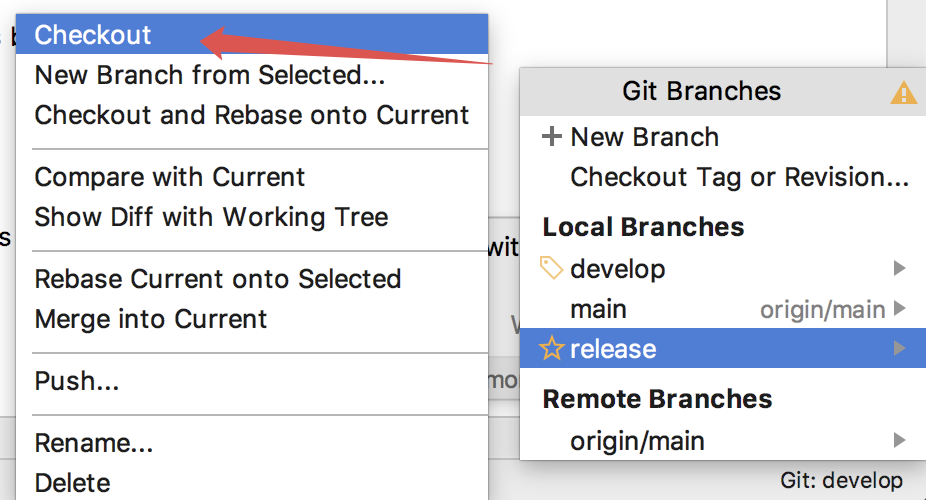 选择一个分支,然后点击 Checkout,可以切换到该分支上:
