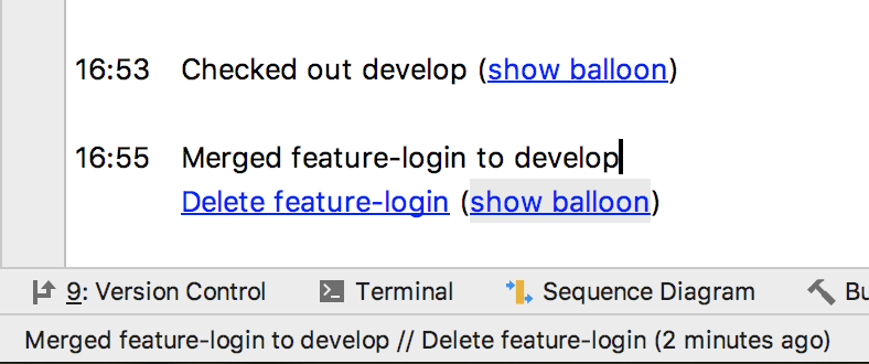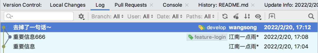 合并完成后,如需删除 feature-login 分支,也可以在 IDEA 日志中顺手删除: