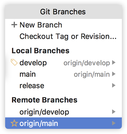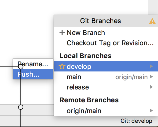 提交完成后,develop 后面多了 origin 前缀,Remote Branches 中也多了 develop 分支,说明提交成功。