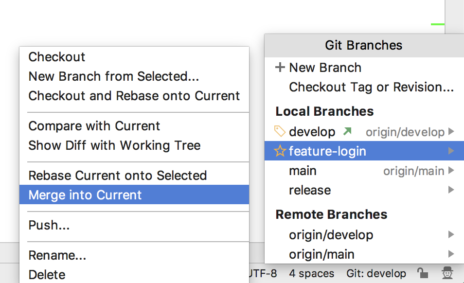 由于我们并不会将 feature-login 提交到远程仓库,所以接下来我们要将 feature-login 合并到 develop 然后将最新的 develop push 到远程仓库,操作方式如下: