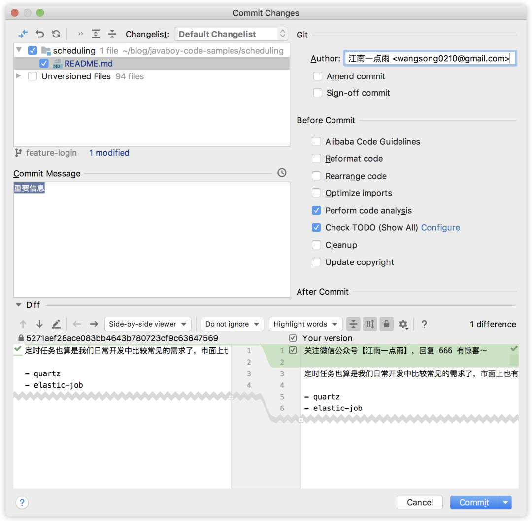 填入提交的 Message,下方也能看到不同版本的内容对比,点击右下角完成代码提交,注意这个只是提交到本地仓库。