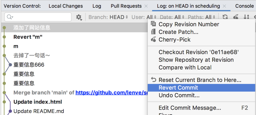 Revert Commit 这个操作到处都能用,不同于 Undo Commit,Revert Commit 之后,会产生一条提交记录。相当于 Revert Commit 其实也是提交,只不过提交的内容刚好相反,刚好刷掉已有内容。