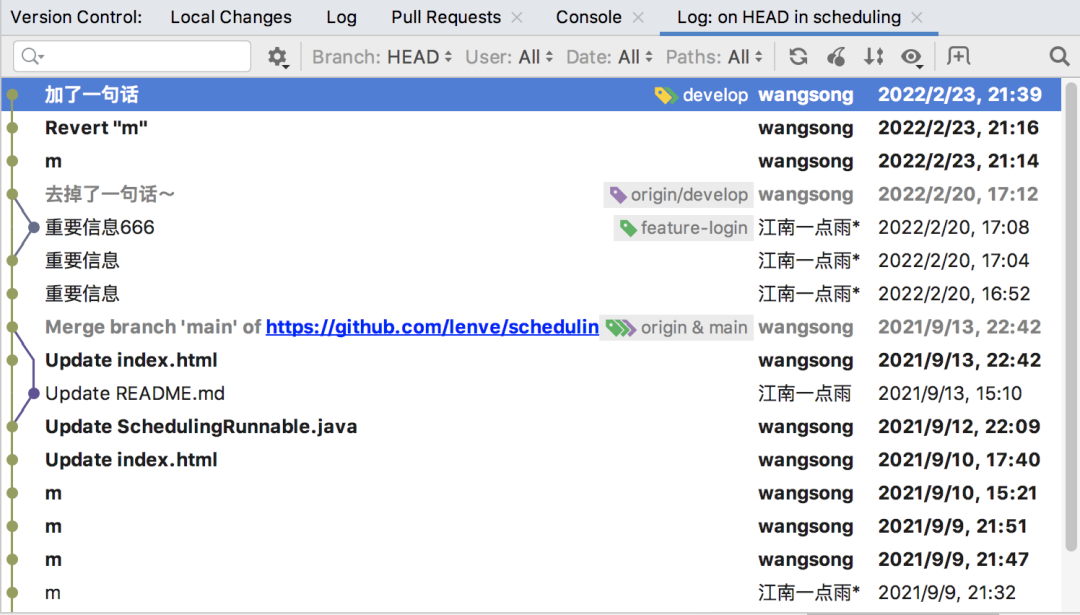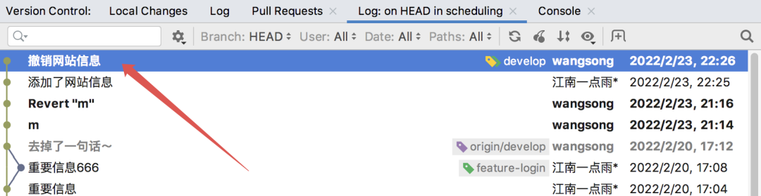 git log 查看当前提交日志:git reset HEAD^^ 向前回退两个版本:695ce1fe,利用 git reset --hard 695ce1fe 命令回到回退之前的状态:git reset --hard HEAD~1 回到上一个版本:当然以上操作都是基于命令行的,如果你命令行操作比较熟练的话,其实命令行操作比 IDEA 上点点点要快很多。