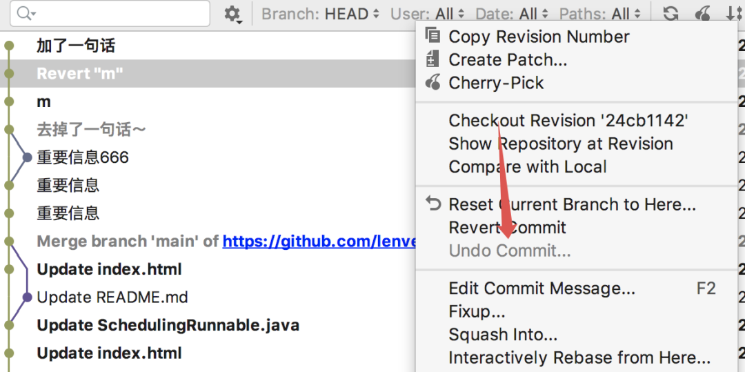 Undo Commit 这个操作只能在最近一次提交上使用,不能在其他提交上使用,最近一次 commit 上,右键单击,如下图: