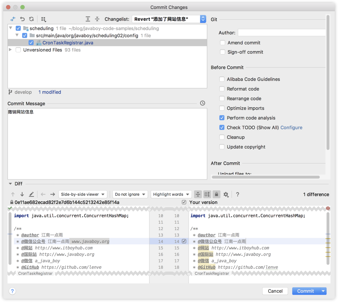 此时会弹出来一个提交的对话框,就是一个普普通通的 commit 对话框,如下: