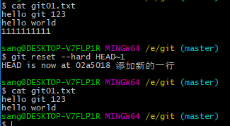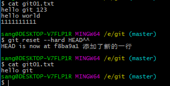 HEAD^ 来描述版本,一个 ^ 表示前一个版本,两个 ^^ 表示前两个版本,以此类推。^,比如说前 100 个版本可以写作 HEAD~100。看下面一系列的操作:
