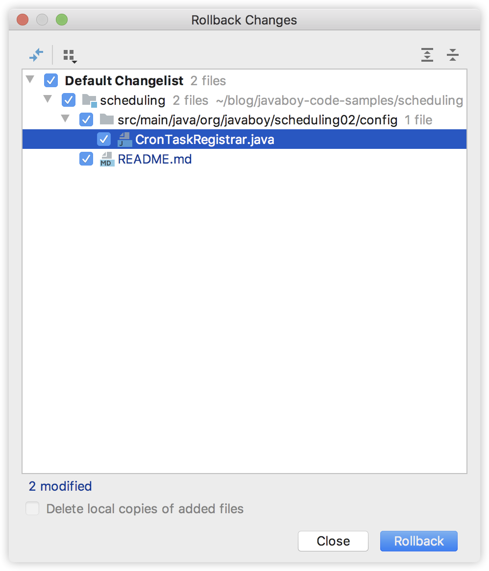 这里会列出来所有修改但是没有 commit 的文件,想要撤销哪个文件的修改,就勾选该文件,然后点击 Rollback 按钮就完成了撤销操作。