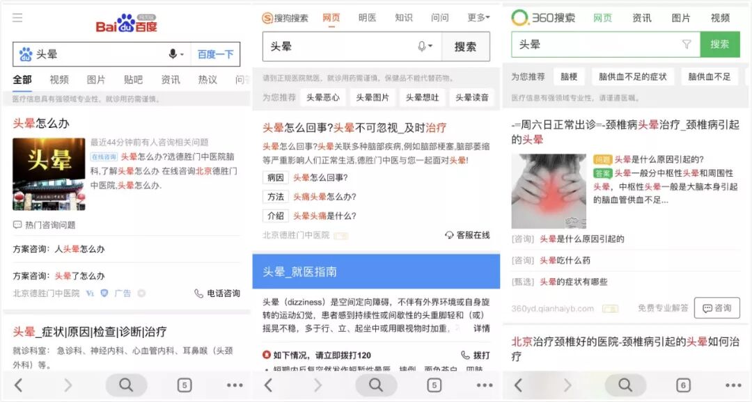 |百度、360、搜狗三个搜索引擎检索“头晕”的结果