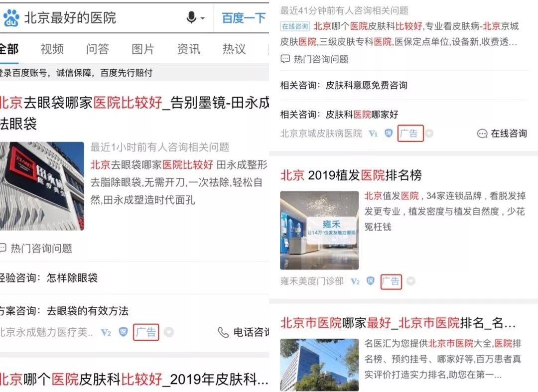 |百度网页版”北京最好的医院“搜索结果,首页有一半的位置是广告
