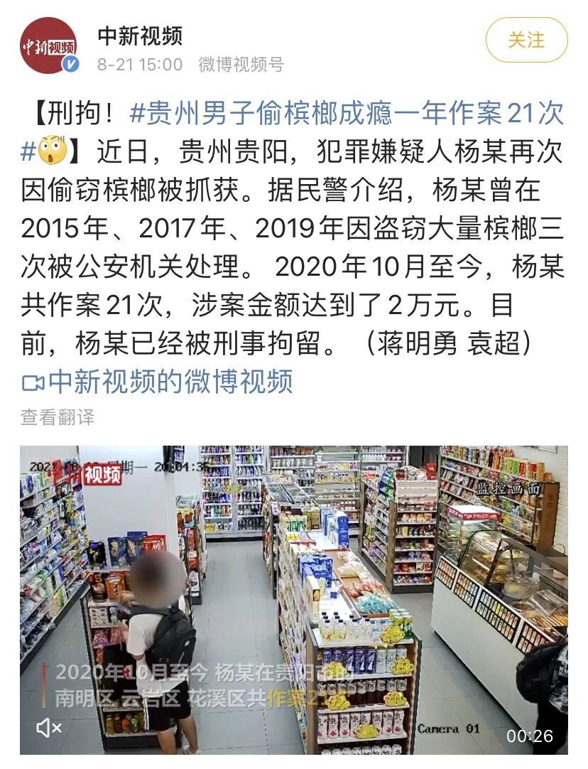 前段时间的一则新闻,贵州一男子为了偷槟榔,一年作案21次,槟榔的上瘾程度可谓疯狂。