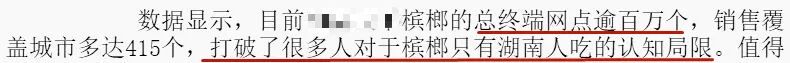 某家槟榔企业甚至在报纸上登喜报,骄傲地宣布“总终端网点逾百万个,销售覆盖城市多达415个,打破了很多人对于槟榔只有湖南人吃的认知局限。”