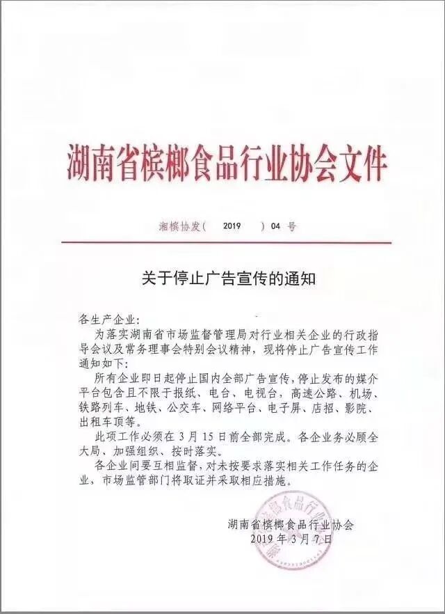 2019年湖南省的槟榔食品行业协会,下发了相关的文件《关于停止广告宣传的通知》,要求所有的企业马上停止槟榔的国内广告宣传。