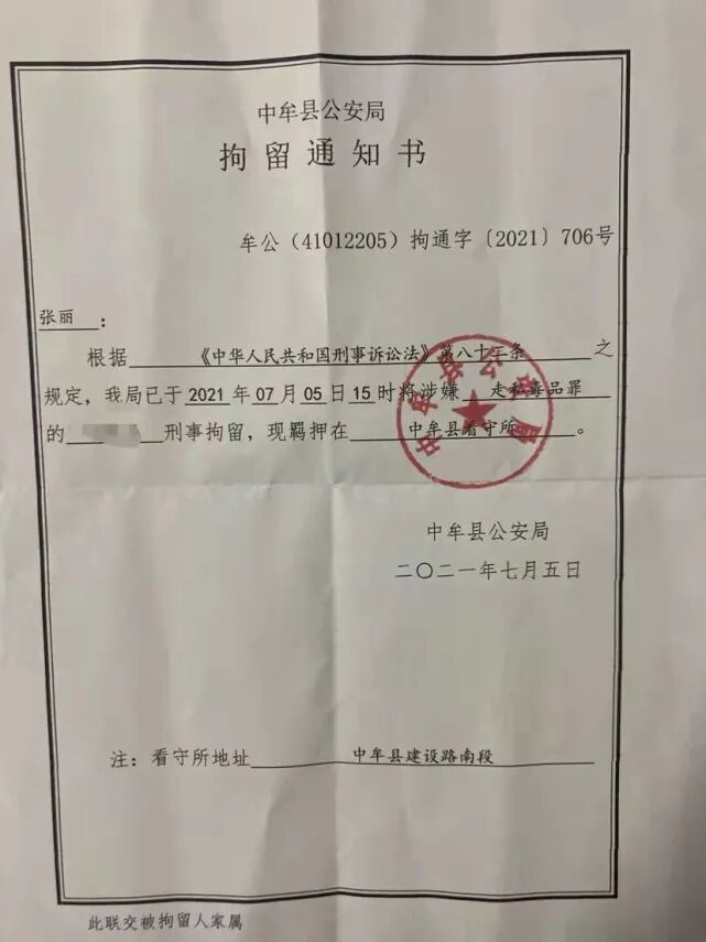 2天后,家人收到逮捕通知书,才知道他是因涉嫌走私、贩卖毒品罪被刑事拘留。