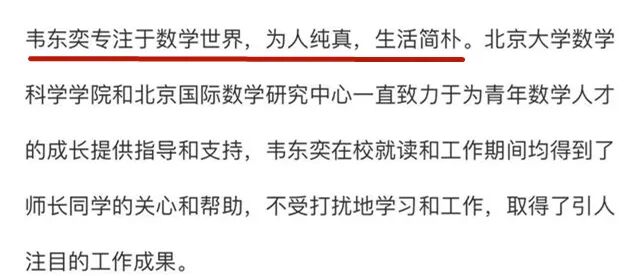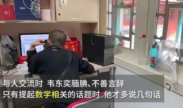 〓 有人看韦东奕总拿矿泉水瓶接水,便给他送了个水壶,他担心师德问题,最终还是没用。“数学上的天才很难定量地确定,但一定不仅仅取决于脑。肯定有我所称的“内分泌因素”,也就是有些人称之为“激情”的东西。”韦东奕最值得被尊重和仰望的,不是那些爽文一般的天才故事,而是他埋首于数学世界,在一遍遍计算推演中失败又再来的勤奋、激情与纯粹。这个世界并不缺少天生有才能的人,相较于天才的智商,更难得的是天才的品格。如果真的要将韦东奕封为神,那么这个神就神在,在这个智力、天赋、价值等等都可以用金钱来衡量的时代,他所求是那么简单:时光倒回13年前,18岁的韦东奕初出茅庐,斩获奥数金奖,面对伸过来的无数话筒和镜头,他重复着一句话:他始终想和这个世界保持距离,因为他的眼里,从来只有数学。他不该是帅哥美女式的流量玩物,而是真的有可能改变人类命运的宝物。只愿这个浮躁的流量时代,还能给他留一方纯粹、干净的天地。1. 专访北大数学奇才韦东奕:钟爱看题和思考,哈佛曾为他打破校规,齐鲁晚报,2021-05-03