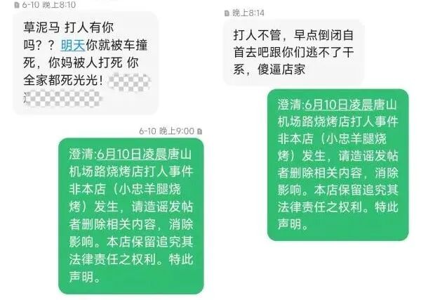 打人事件曝光后,一些人通过外卖平台和店铺招牌下留的预约号码,找到了店主们的联系方式,开始打电话或发短信辱骂