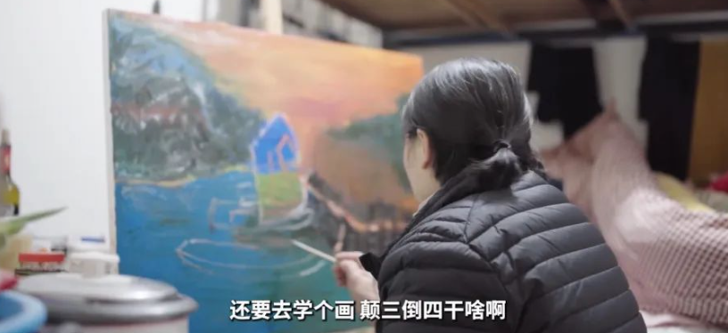 她毅然决然地坐上了高铁,找到了那个传说中“免费教画画”的画室。这里确实免费,每个人三块画板,三支笔。同学很多,而王柳云完全没有基础,只有一个想通过画画发财的梦。王柳云想到了那盏“让一个普通女人变富”的马灯,于是她说,我想画马灯。她在油画板上落下了第一笔,接着是第二笔,第三笔……助教惊讶,因为没想到之前完全没基础的她,能够完成这么好。王柳云惊讶,因为她从画画中找到了一股从未有过的力量。在画室里,她第一天画马灯,第二天画帽子,第三天就开始跳级,画起了窗外的风景。别人看到她的画,都啧啧称奇,问她什么时候开始学画画的?王柳云的老师看好她,说她可以,甚至可以帮她开画展,还把画挂到网上售卖,初出茅庐的王柳云,第一幅画就卖出了150块钱。王柳云心想,这么傻的画都能卖得出钱,那我一定要好好学画。于是王柳云回到老家,从银行贷款了5000块钱,作为自己的画画资金。只有300块的时候,她就敢离开家、不工作、去学画;说来也怪,17年已经说她因为心脏病,医生说她奄奄一息了,17年学画画之后,她却从来都没有再不舒服过了。50多岁的王柳云从未有这样的感觉,画画让她收获了新生。每年过年前夕,她都会回浙江老家,在家附近当几个月的服务员,赚一笔路费、学费。当村里的其他人知道王柳云做完短工还要去学画的时候,对她表示了前所未有的不可理喻。村里下雪了,极美的景色,王柳云徒步跑了几十公里,想把美景刻在脑海里,变成下一次创作的养料。