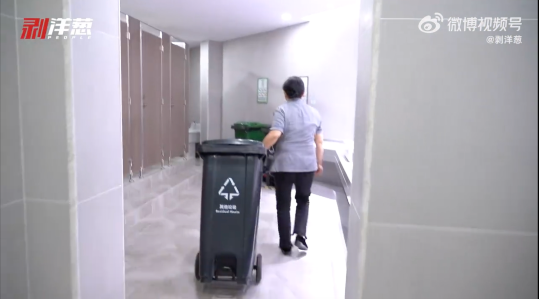 平日里,她和所有熟练的清洁工一样,洒扫着马桶和洗手池,把垃圾桶上套上袋子,把比自己还高的垃圾桶拖进垃圾堆里。