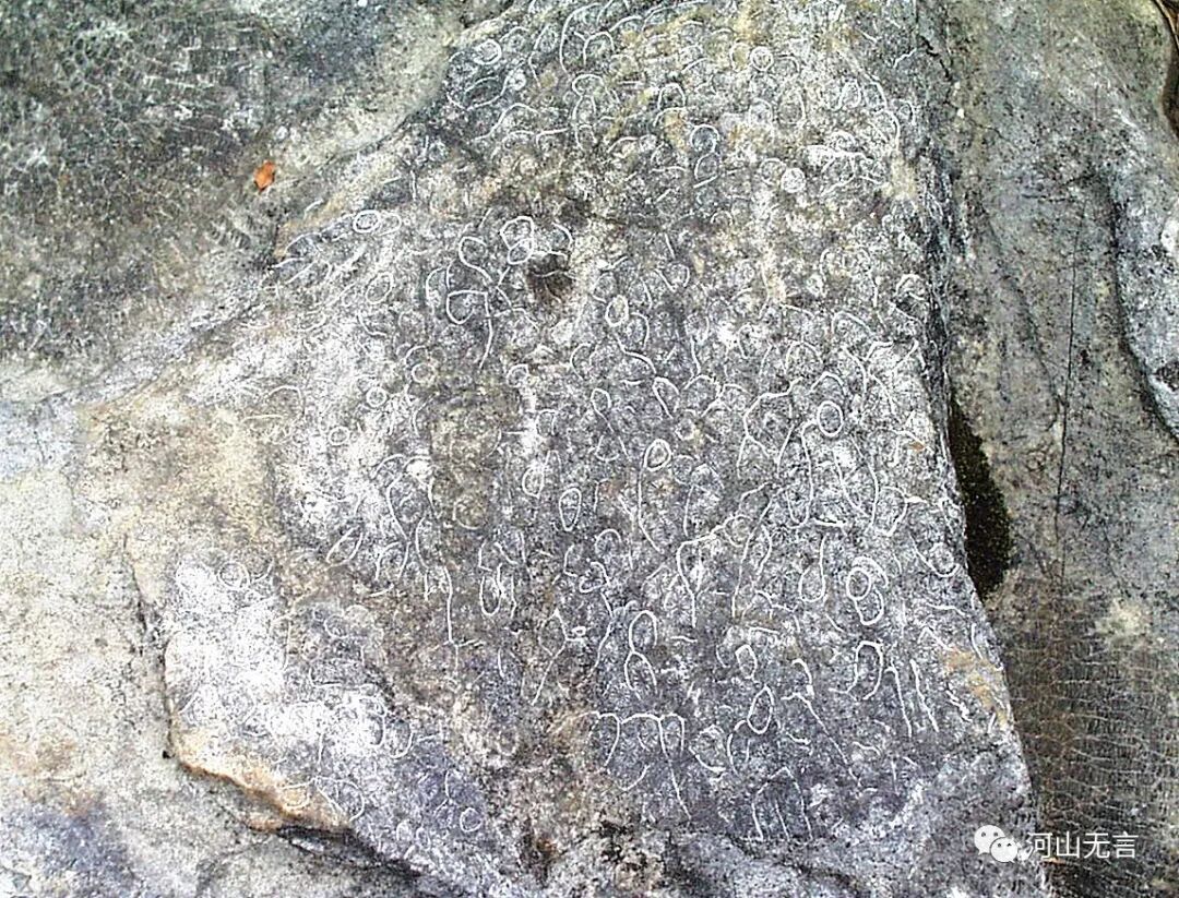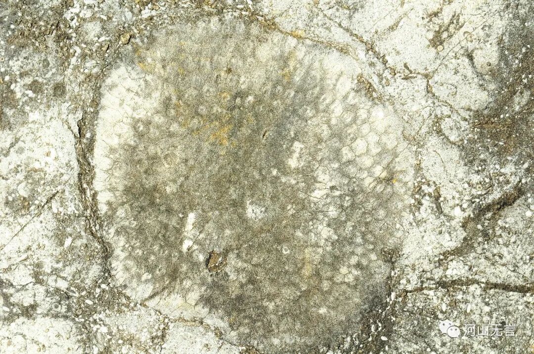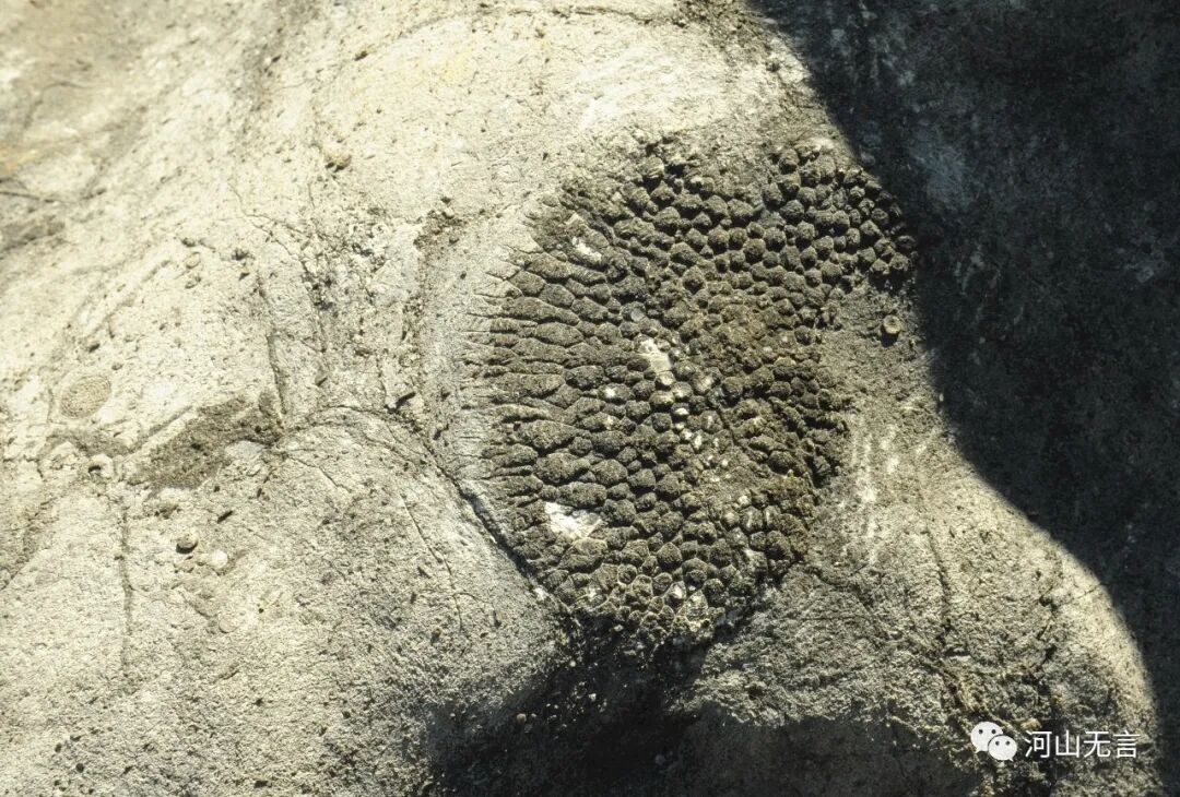小岩湾二叠系石灰岩中的群体珊瑚化石,由许多单个珊瑚群聚而成。上图和中图的群体珊瑚周边,还可见到许多纺锤虫、海百合茎化石。范晓摄影