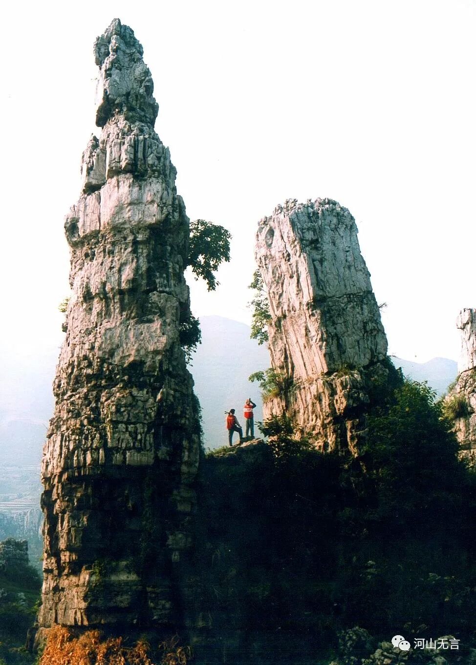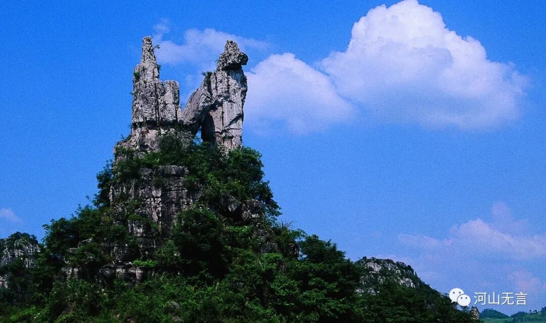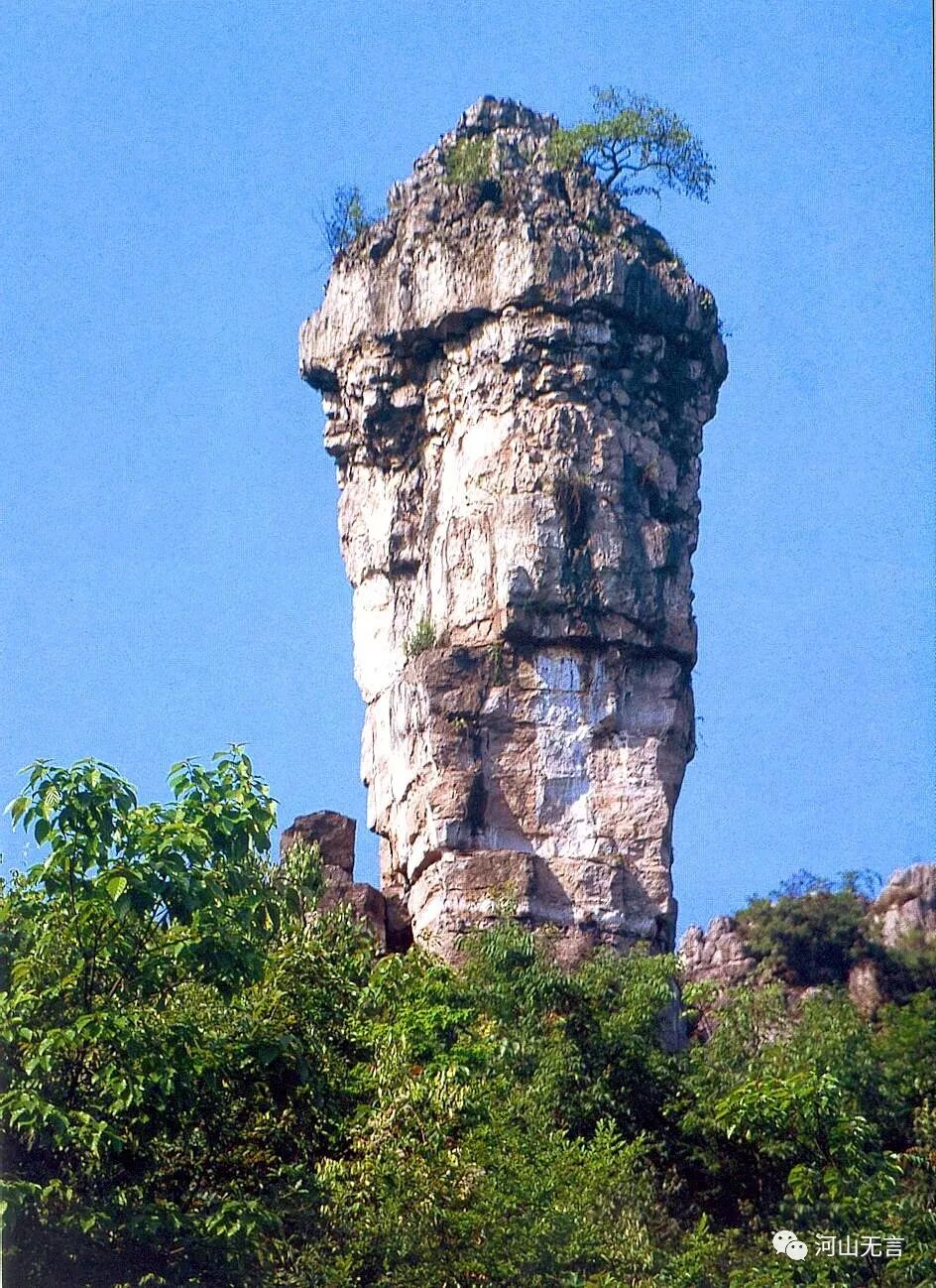 小岩湾园区的喀斯特象形石柱,由上至下依次为:夫妻峰、斜塔、石蘑菇、雄起塔。