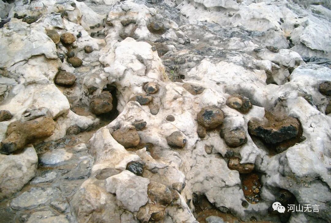 兴文小岩湾二叠系石灰岩中的灰黑色燧石结核,燧石结核的主要成分为硅质(SiO2),对其成因有不同解释:一是和海底火山活动有关的硅质热液沉积;二是来源于硅质生物的沉积,例如在燧石发现有硅质海绵化石,火山热液带来的硅质也通过海洋生物的吸收、沉淀为燧石结核。范晓摄影