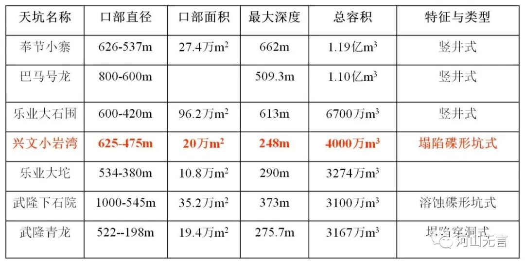 小岩湾天坑,峭壁环绕,深藏巨壑,形似碗状,长径625米,短径475米,最大深度248米,口部面积20万平方米,总容积为4000万立方米,以总容积来看,在世界天坑中排名第五,其它各项数据也在世界上名列前茅,堪称世界级的大天坑,由于它是中国最早发现和研究天坑的地方,因此被喀斯特学者称为“中国天坑的故乡”。