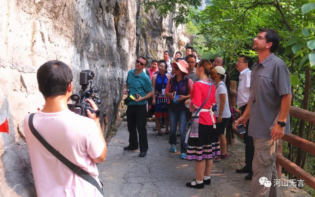 2013年,兴文世界地质公园接受联合国教科文组织第二次中期评估,图为评估专家伊利亚斯(左二)、史蒂芬(右一)在兴文小岩湾天坑观察地质剖面。范晓摄影
