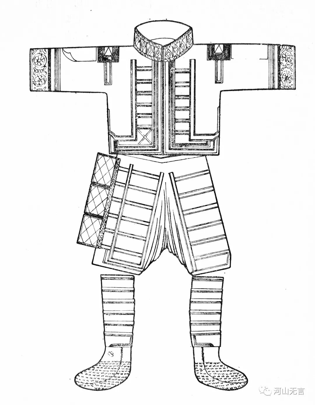 与兴文相邻的珙县麻塘坝悬棺中的僰人服装。衣料为有白色暗花的绸布,衣领、袖口、前襟、裤管等处,用黄、蓝、红等色的绸料或色线装饰成花边。据陈明芳