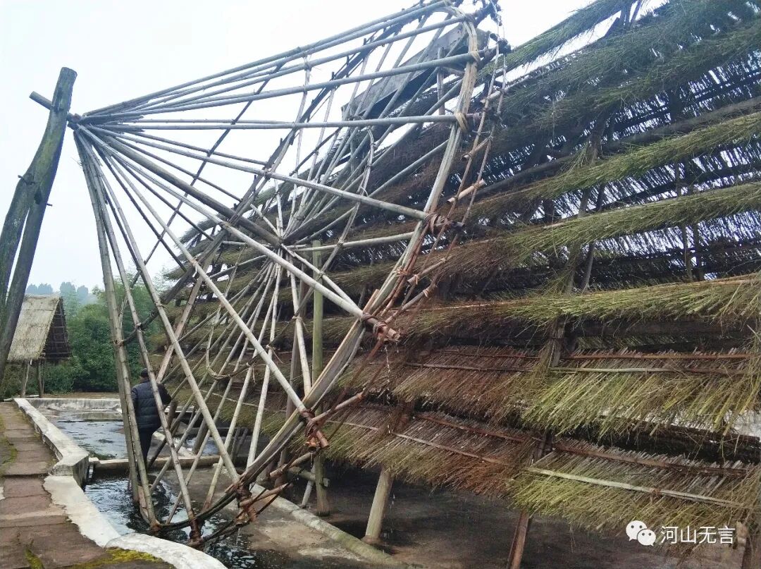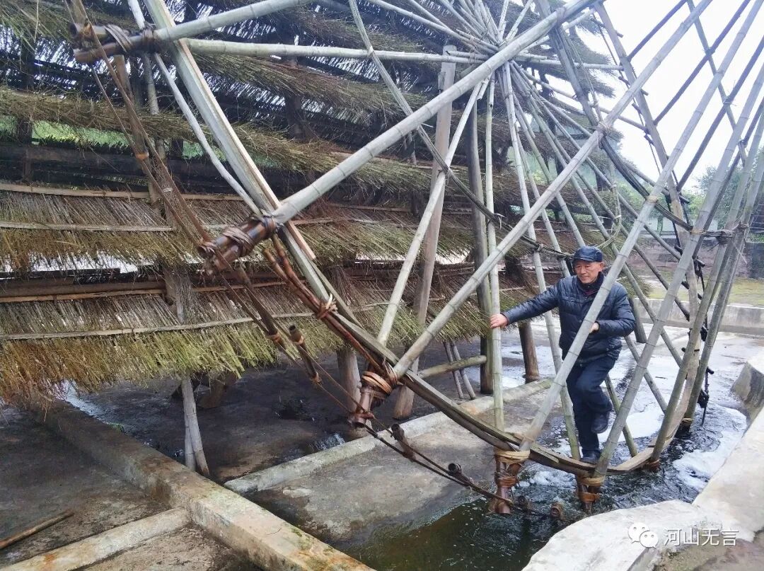 由卓筒井汲出的卤水,需先输至晒盐坝,通过筒车把卤水送到高处,洒在铺满荆竹桠的棚架上,卤水在往下渗流的过程中,经日晒风吹,蒸发浓缩,如此往复,使卤水达到入灶房熬制的浓度。筒车靠人在上面走动施力而转动。