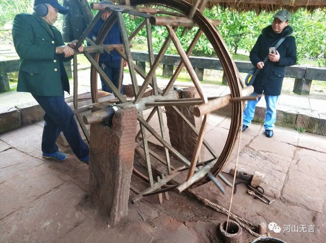 卓筒井汲卤流程:将汲卤竹筒提升出地表。