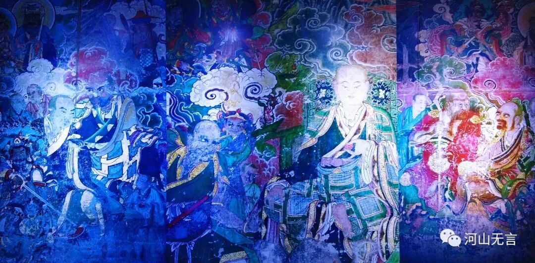 遂宁蓬溪县宝梵寺壁画局部。宝梵寺壁画绘制于明成化二年(1466),共计104平方米。取材于《大阿罗汉难提密多罗所说法住记》等梵典故事。壁画现存10铺,缺损2铺。采用工笔重彩,沥金挤粉等技法,绘有法像103人,具有很高的艺术造诣,在中国壁画史占有重要位置。