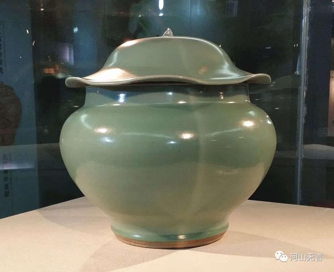 遂宁金鱼村宋瓷窖藏之龙泉窑青瓷:梅子青荷叶盖罐。国家一级文物,四川宋瓷博物馆的镇馆之宝。是金鱼村窖藏中器形最大的一件,通高31.5厘米,腹径31.7厘米,出土时罐内装有99件菊瓣碟。青瓷荷叶盖罐以前仅见于元代,这是首次在南宋窖藏中发现。