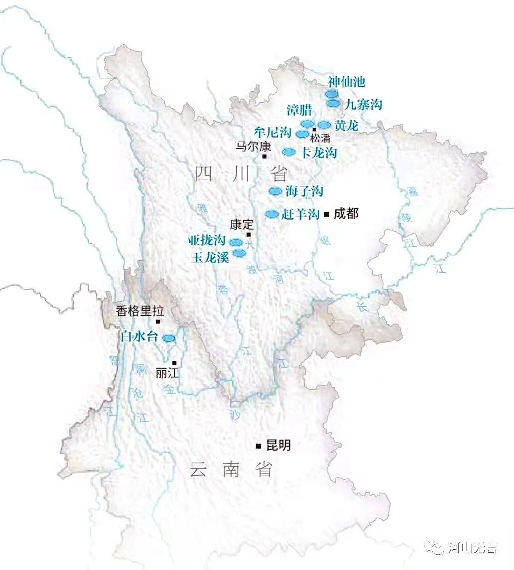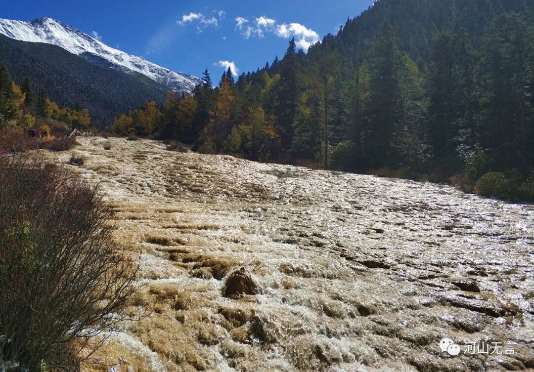 无独有偶,横断山最精彩的钙华堆积,似乎都和著名的高峰形影不离,岷山主峰雪宝顶周边,除了九寨沟、黄龙,还有牟尼沟、神仙池;蜀山之王贡嘎山附近有玉龙溪、亚拢沟;哈巴雪山旁侧有白水台,等等。它们都有类似的地质构造背景。