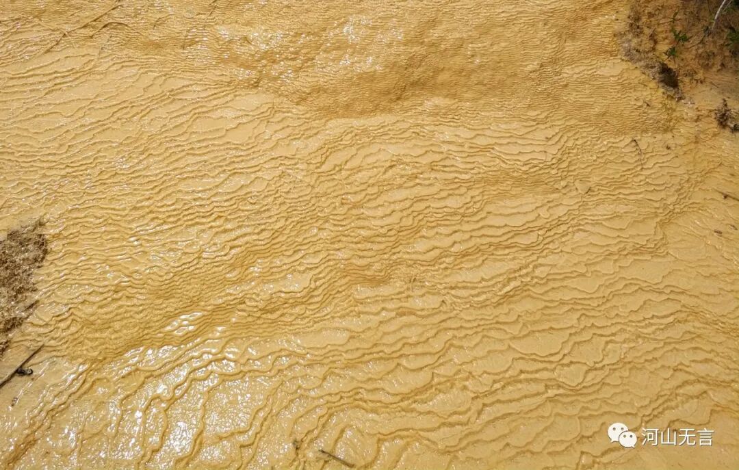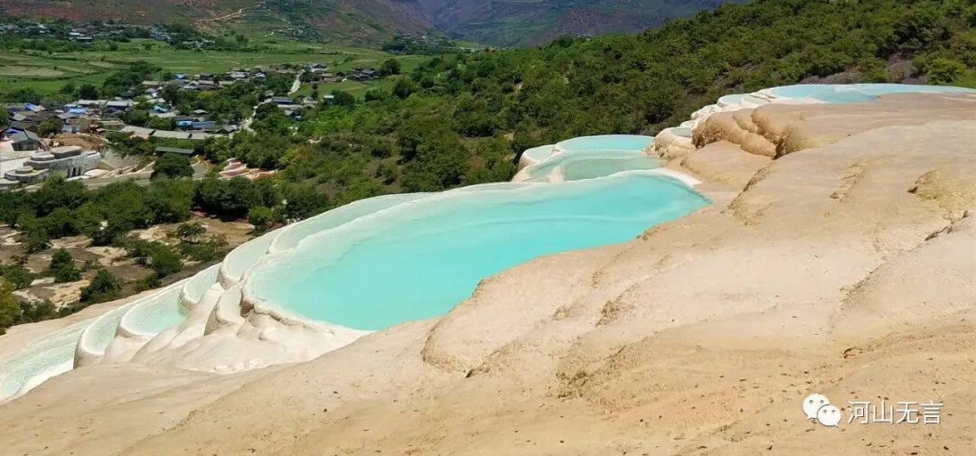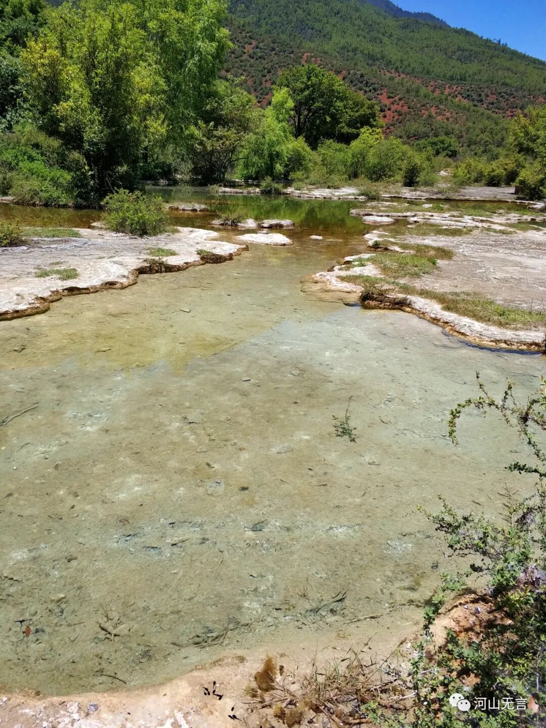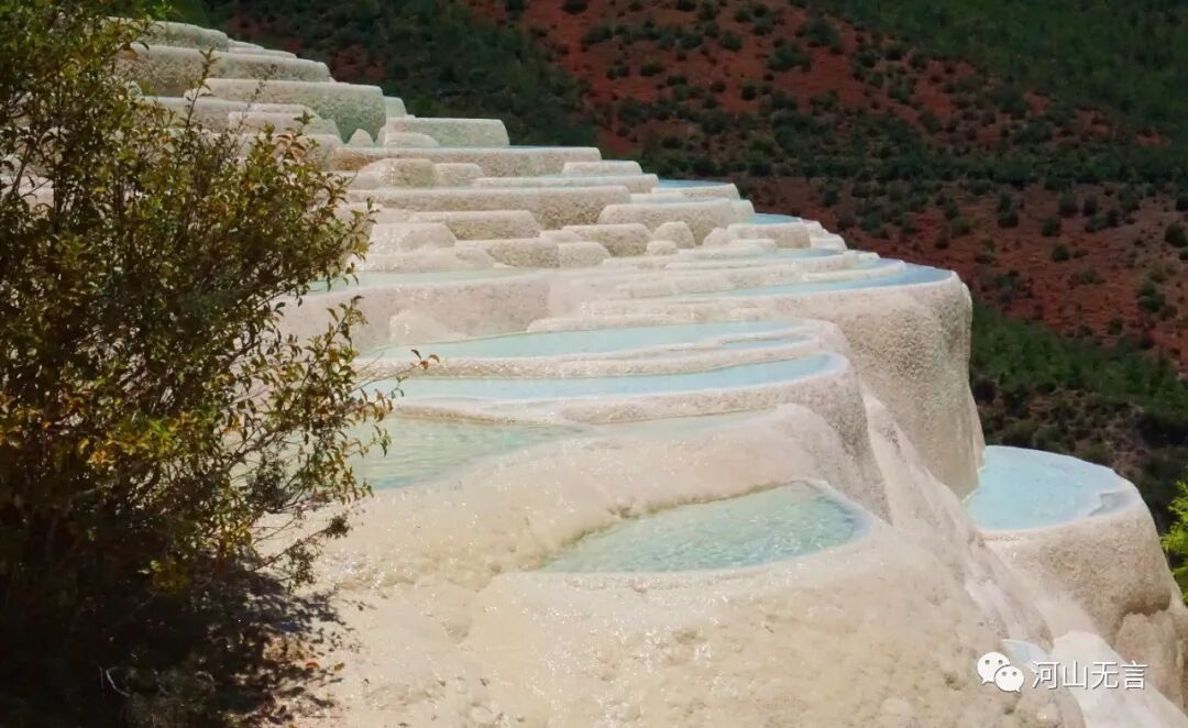 钙华池:多见于地势较平缓的钭坡台地,它可以看成是放大的鱼鳞状波纹流痕,每一个波纹状的小坑都有可能生长、合并、扩展成更大的水池。
