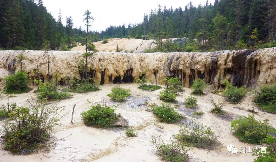 例如,黄龙沟东边的张家沟,虽然没有黄龙那样的钙华池群,但沟中却有厚度巨大的古钙华堆积层,据同位素测年,其形成约在1万年至3万年前;又如白水台所在山谷的右侧,整个山坡几乎都由古钙华体构成,而且白水台下方的古钙华层也一直延伸到三坝乡以下的白水河主沟中。