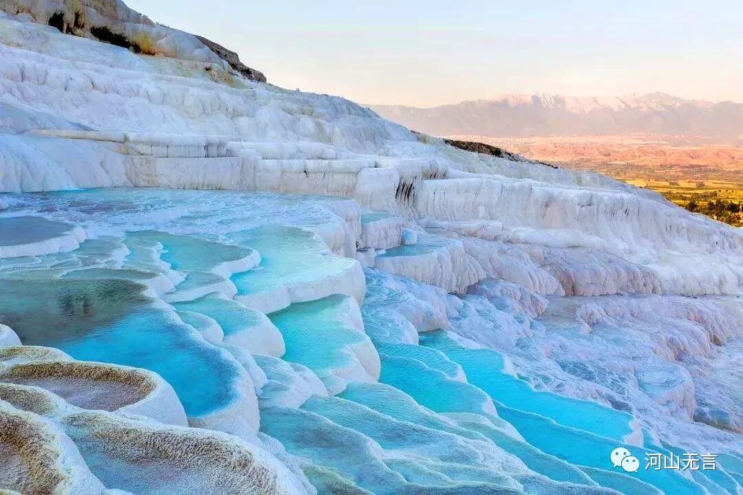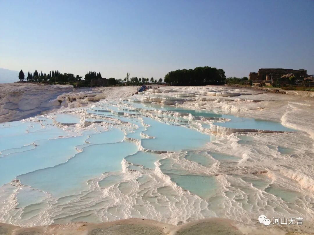 在土耳其的棉花堡,由安纳托利亚高原向地中海过渡的地形斜坡带,形成了与黄龙类似的钙华池、钙华瀑、钙华滩景观。