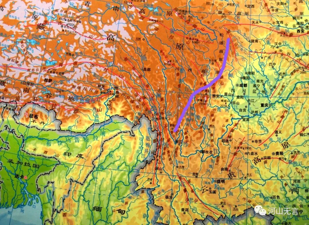 横断山东缘钙华景观带的地理位置(图中紫色线条所示)。
