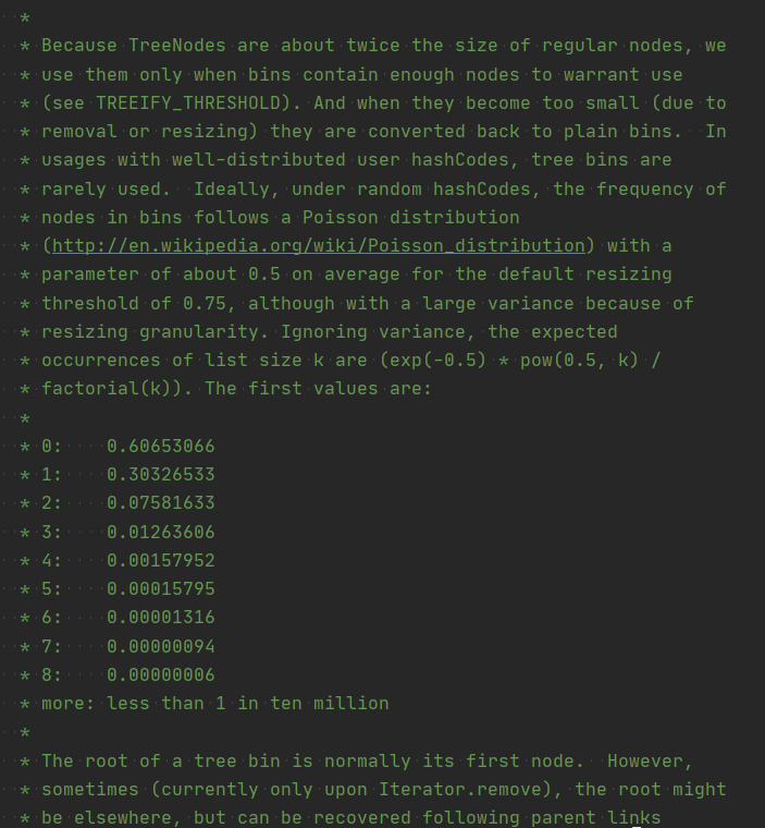 简单翻译一下:理想情况下,在随机hashCodes下,bin中节点的频率遵循Poisson分布(