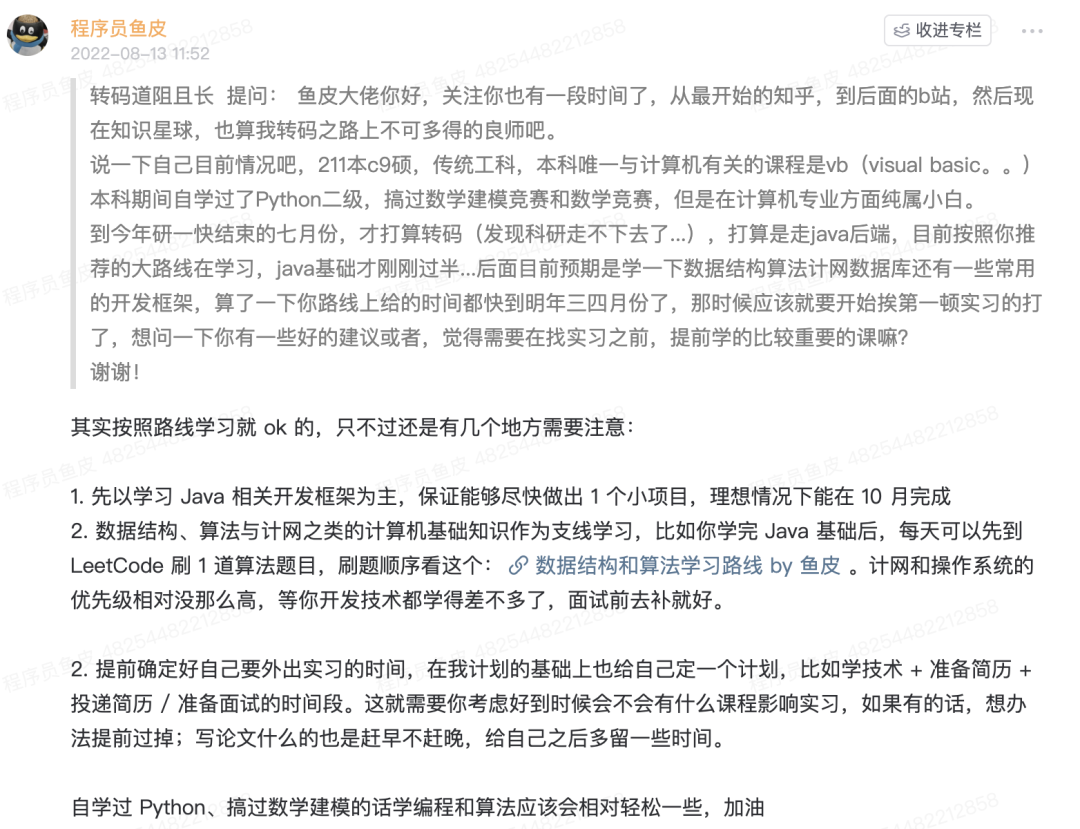 鱼皮光在星球里就回答了 2000 多个 问题,编程学习、求职指导、技术问题、系统设计等应有尽有。我还对大家经常关注的问题进行了整理,汇总为 学习指南,加入星球后阅读一圈,就能帮你解决疑虑。