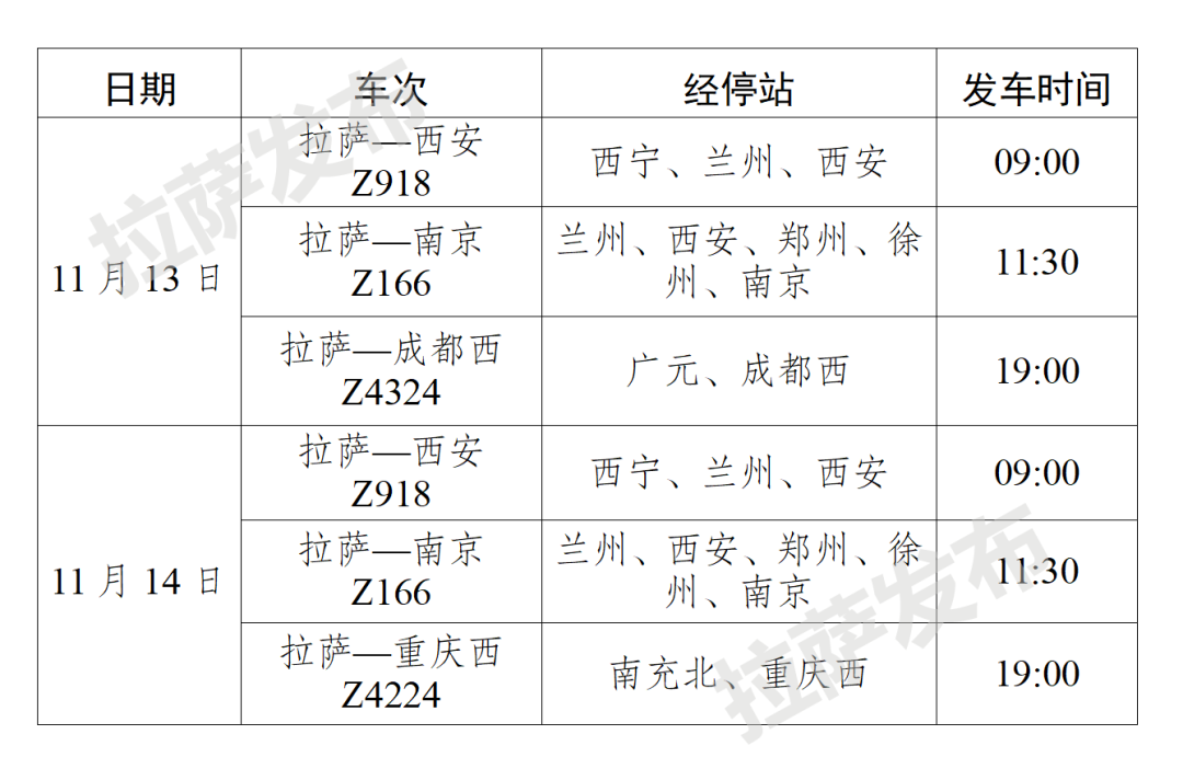 11月13日、14日,拉萨出藏列车有6趟……(附车次、票价、联络方式)