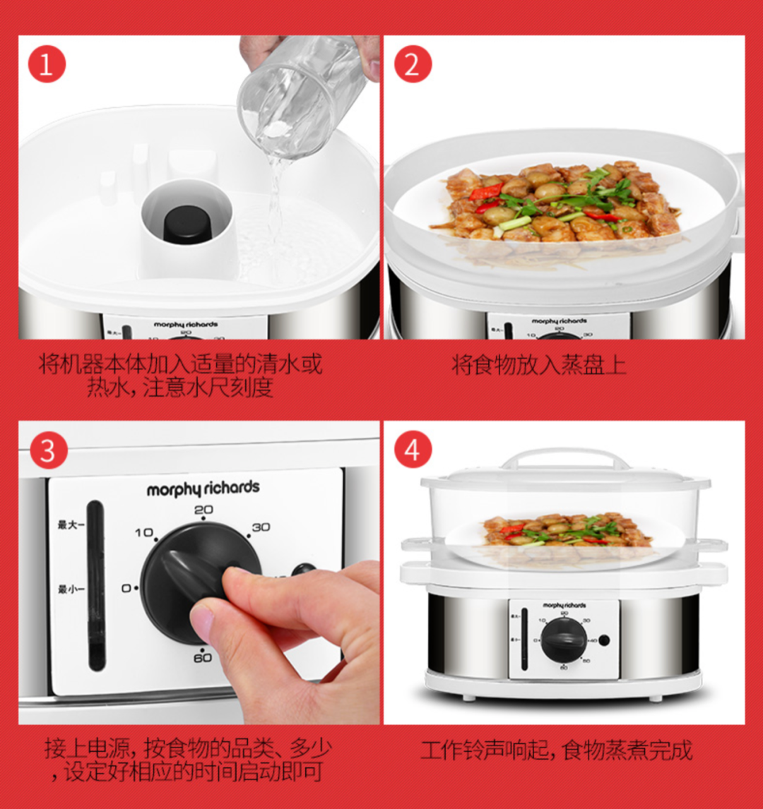 ③旋钮控制,食物蒸煮准确定时,操作简单方便,老人亦可轻松掌握,完毕铃声提醒,无需人工看