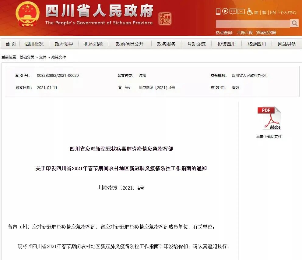 现将《四川省2021年春节期间农村地区新冠肺炎疫情防控工作指南》印发给你们,请认真遵照执行。