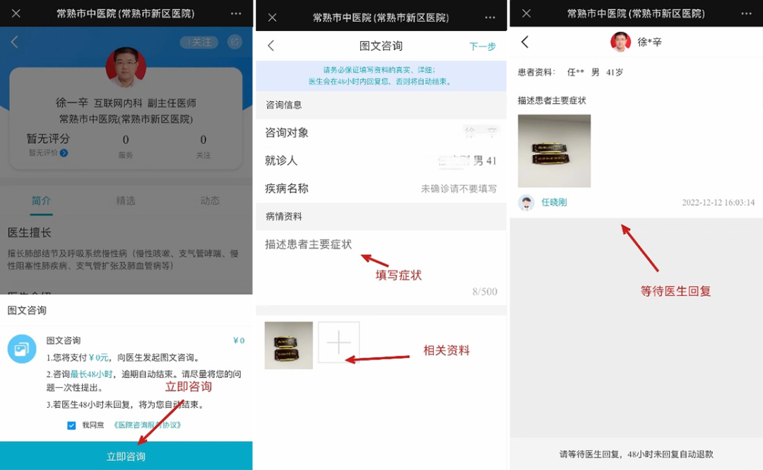 选择咨询医生,描述主要症状并上传资料,等待医生回复咨询。