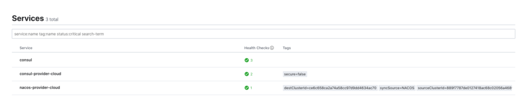 @SpringBootApplication@EnableFeignClientspublic class ConsulProviderApplication {public static void main(String[] args) {SpringApplication.run(ConsulProviderApplication.class, args);}// 引用Nacos同步过来的服务@FeignClient(name = "nacos-provider-cloud")public interface HelloService {@RequestMapping(value = "/hello", method = RequestMethod.GET)String hello();}}