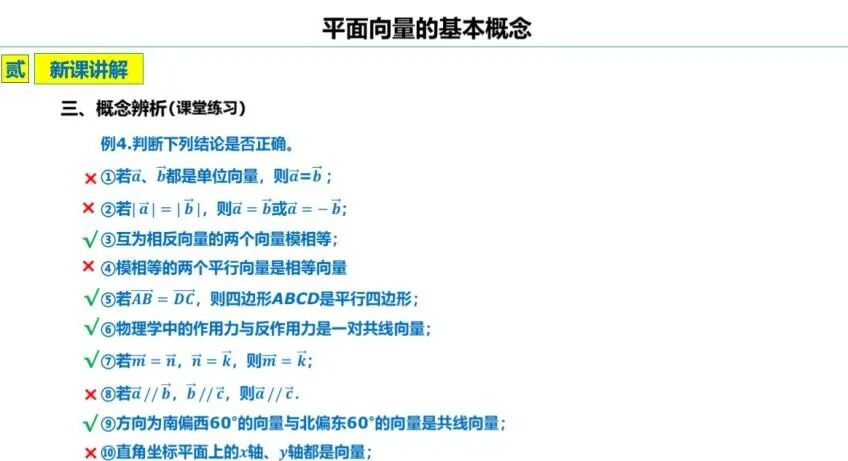 一组课堂练习,主要围绕向量的相关定义进行设置,以帮助学生进一步理解相关概念。