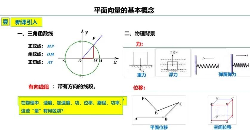 从三角函数线的复习,重温向线段的相关概念,并通过物理背景下力和位移两个矢量分析,提出有向线段的方向根据需要是可以任意的,从而为向量概念的提出奠定基础。
