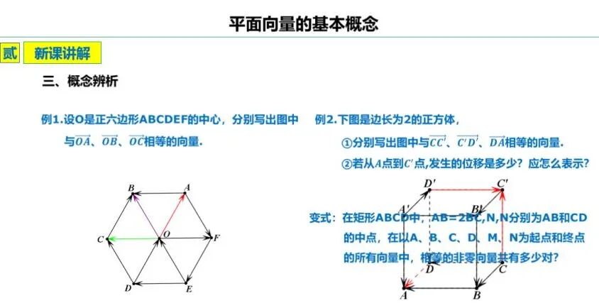 三个概念辨析,从图形的角度、平面和空间不同形式,帮助学生进一步理解共线向量、相等向量的概念。