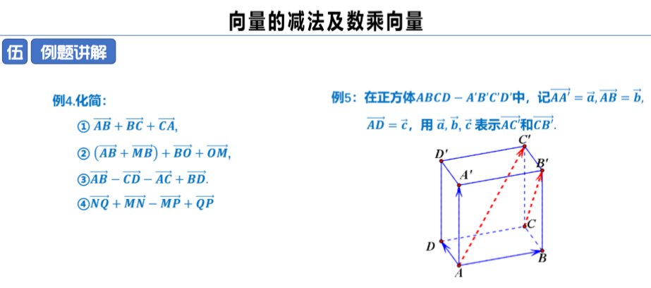 例5的设置,主要对通过空间图形中向量的处理,进一步理解向量的自由特性,同时通过图形运算,灌输将任意向量用指定向量表示的“统一化”思想,初步体会平面向量基本定理。