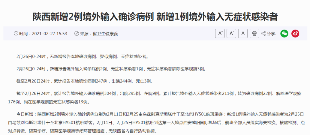 陕西新增2例境外输入确诊病例分别为2月11日和2月25由乌兹别克斯坦塔什干至北京HY501航班乘客;新增1例境外输入无症状感染者为2月25日由乌兹别克斯坦塔什干至北京HY501航班乘客。
